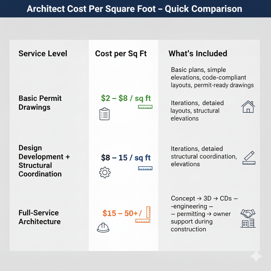 Even though architects offer multiple pricing models, per-square-foot pricing remains the easiest for homeowners to understand and compare.